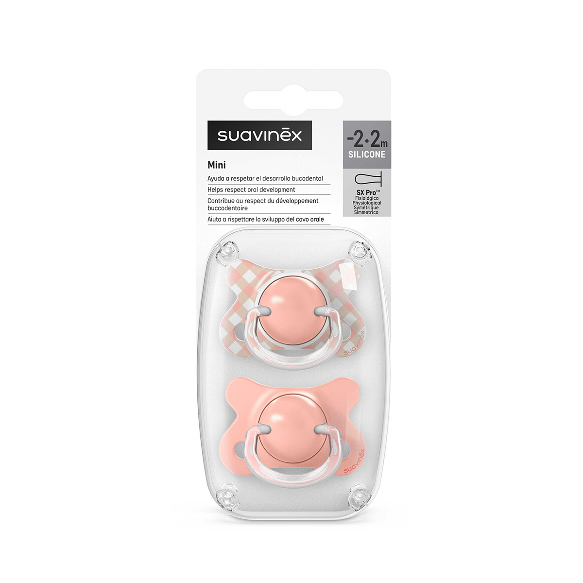 זוג מוצצי -2+2 SX PRO מיני, פותח ותוכנן במיוחד על ידי אורתודנטים ומומחים עבור הרגעים הראשונים של החיים, לניובורן ואף לפגים. עם פטמת SX PRO היחידה ששומרת על ההתפתחות הטבעית של פה התינוק, מדמה שימוש במוצץ שהכי קרוב לאי שימוש במוצץ, ומעניקה תחושת רוגע מלאה.