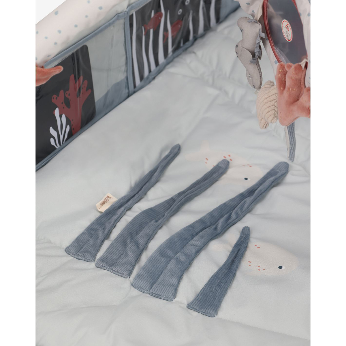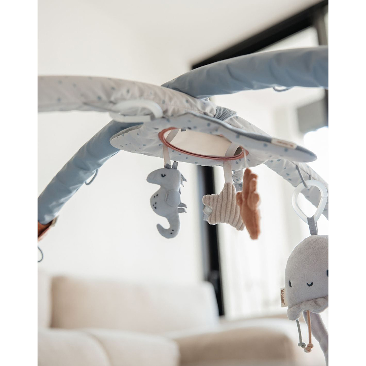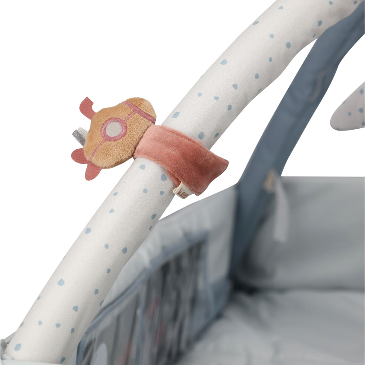שוליים מתקפלים המאפשרים “סגירה של המשטח למצב “אמבטיה” בטוח, שתי קשתות מתכווננות עליהן ניתן לתלות צעצועי פעילות בגבהים ומיקומים שונים למשחק בשכיבה על הגב או בישיבה,