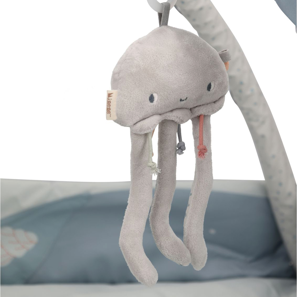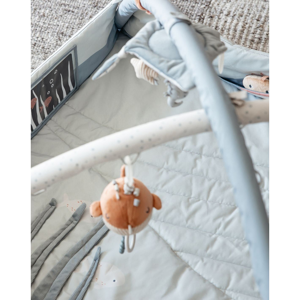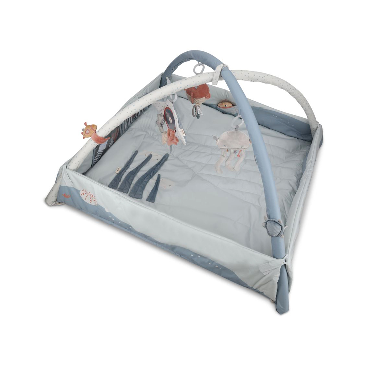 שוליים מתקפלים המאפשרים “סגירה של המשטח למצב “אמבטיה” בטוח, שתי קשתות מתכווננות עליהן ניתן לתלות צעצועי פעילות בגבהים ומיקומים שונים למשחק בשכיבה על הגב או בישיבה,