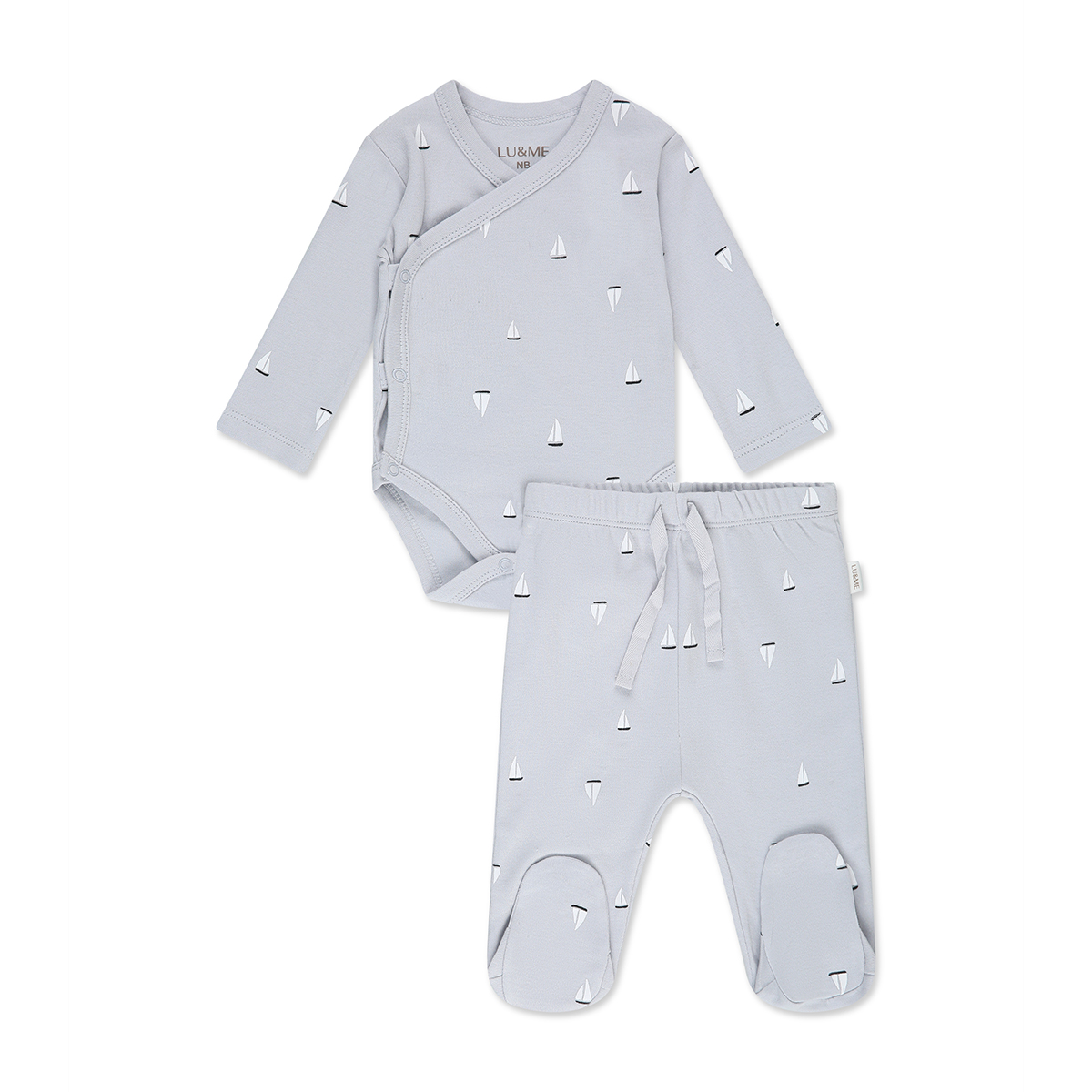 סט נעים ומלטף לתינוק, כולל בגד גוף מעטפת ומכנסיים עם רגליות, עשוי בד ריב/אינטרלוק איכותי מ-100% כותנה. הבד הרך והאוורירי מעניק נוחות מקסימלית לאורך כל היום ושומר על עורו העדין של הבייבי.