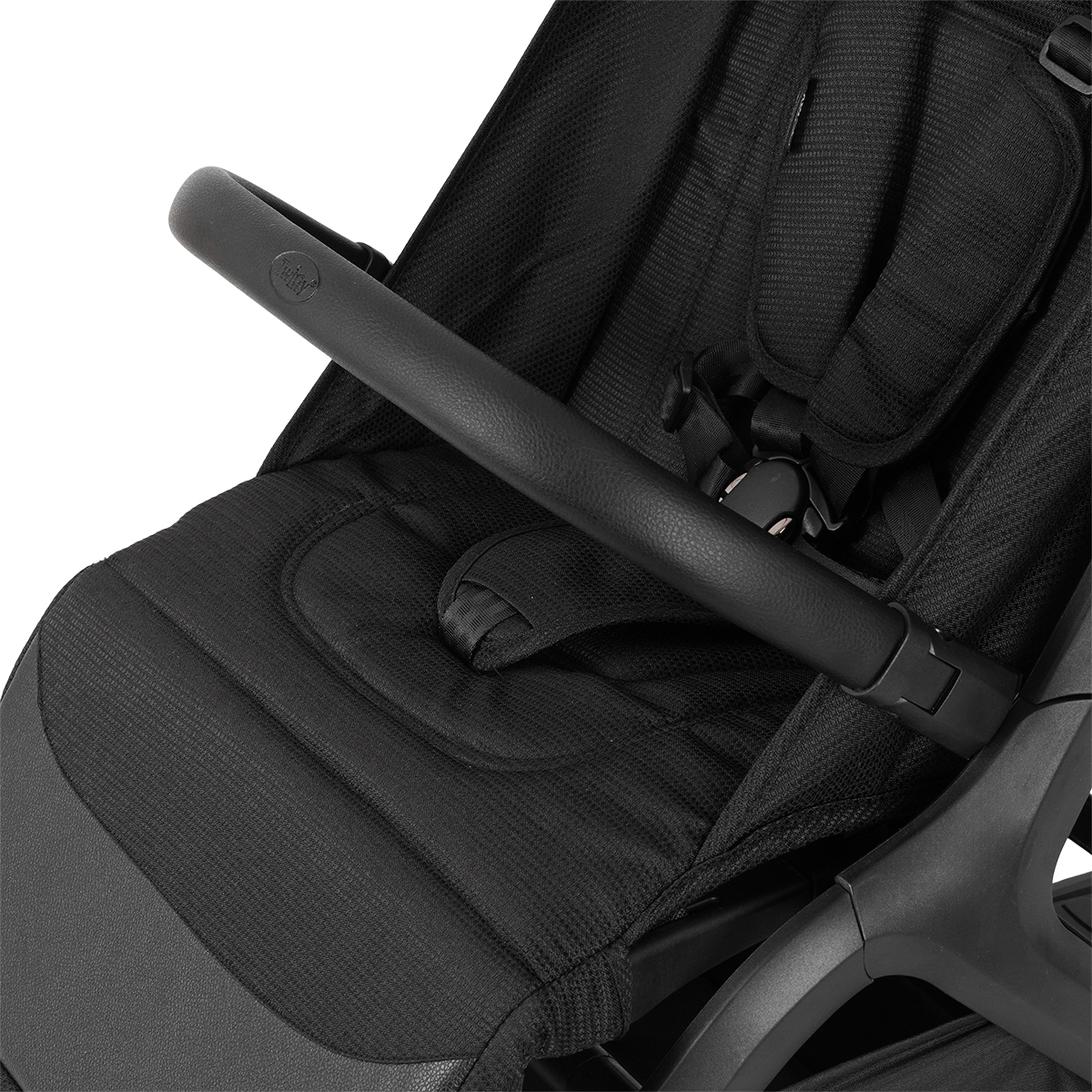 לעגלה מערכת רצועות בטיחות עם 5 נקודות חגירה ובלם אחורי המאפשר עצירה מלאה של הגלגלים לאבטחה, יציבות וביטחון בכל תנועה.