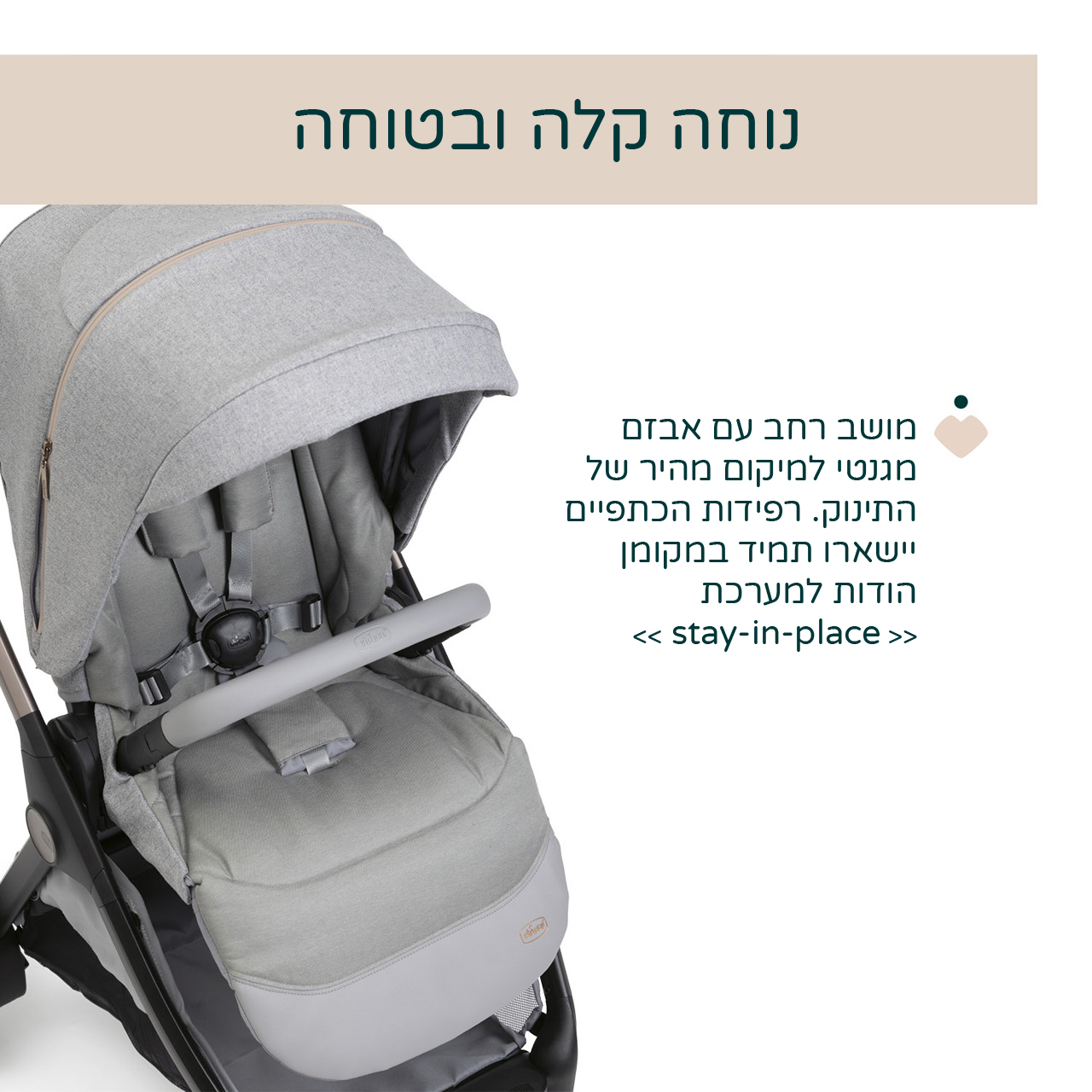 סל השכיבה מעוטר בפרטים יוקרתיים שמוסיפים לו סטייל. החל מתג המותג של Chicco, רוכסנים מבריקים והבדים הרכים. תהנו משילוב מדויק של סטייל ופונקציונליות, הנוטף יוקרה.