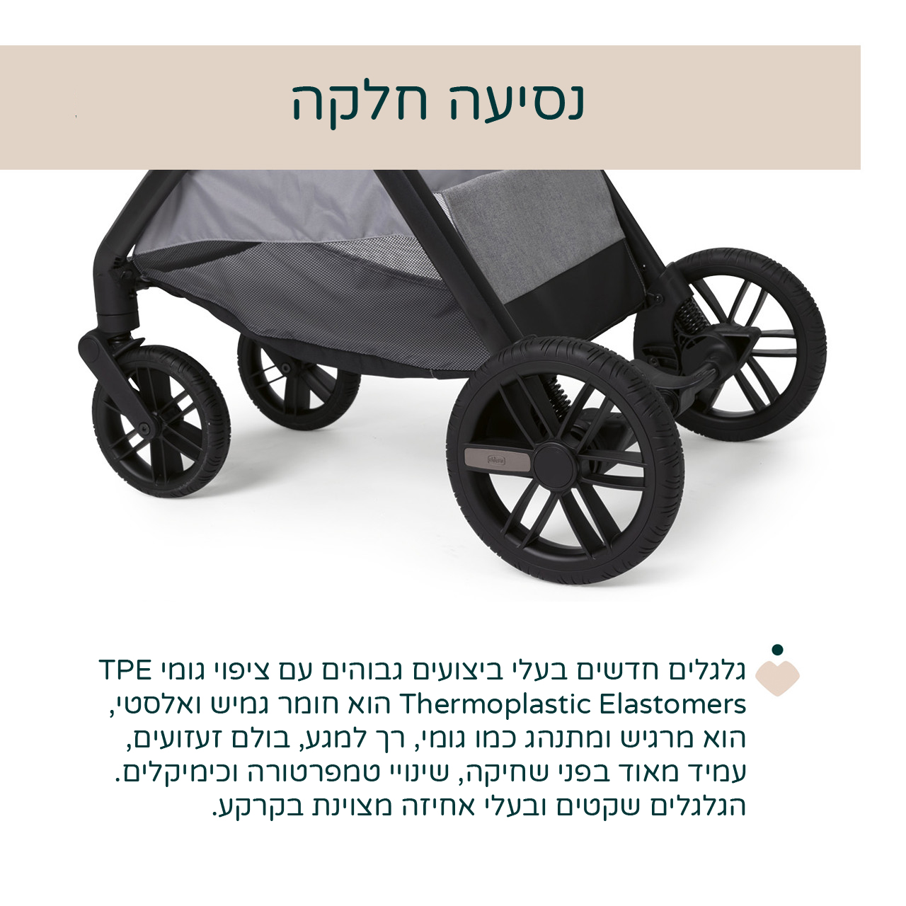 Thermoplastic Elastomers הוא חומר גמיש ואלסטי, הוא מרגיש ומתנהג כמו גומי, רך למגע, בולם זעזועים, עמיד מאוד בפני שחיקה, שינויי טמפרטורה וכימיקלים. הגלגלים שקטים ובעלי אחיזה מצוינת בקרקע.