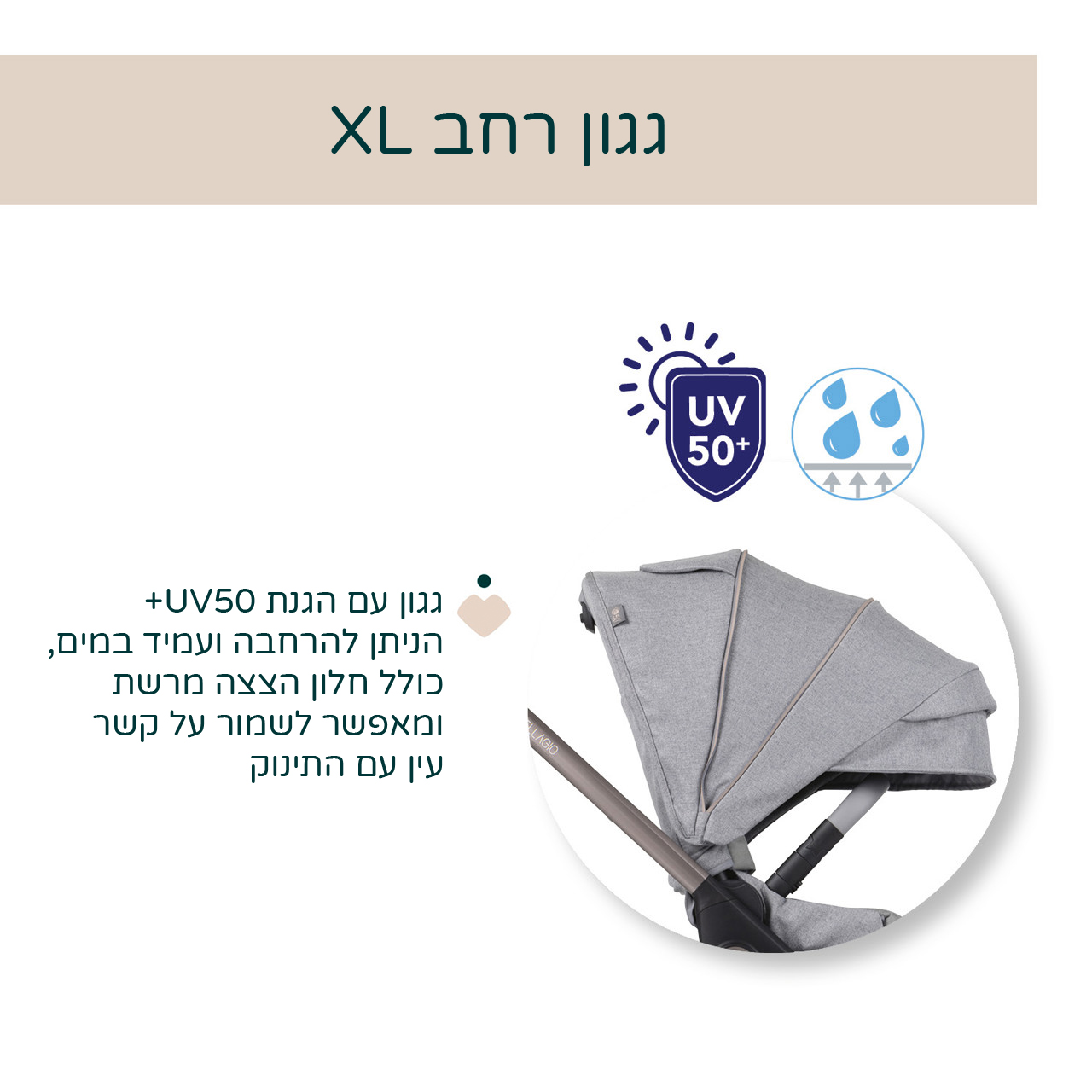 גגון UV50+ הניתן להרחבה ומציע הגנה מפני רוח, אור ושמש ועמיד במים. כולל חלון הצצה מרשת כדי לשמור על קשר עין תמידי עם התינוק.