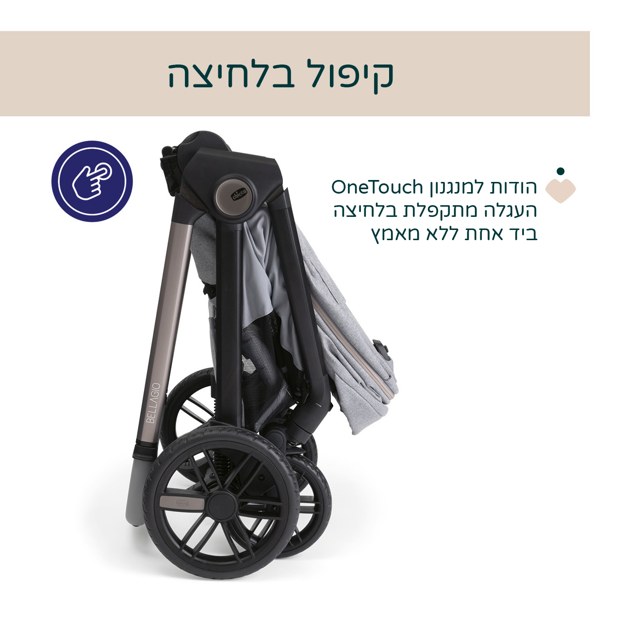 לעגלת בלאג’יו מנגנון חדשני OneTouch המאפשר לקפל את העגלה בלחיצה אחת- לחיצה על גב המושב והעגלה תתקפל ותעמוד באופן עצמאי, בנוסף – ניתן להתאים את משענת הגב גם היא ללא מאמץ וביד אחת, מה שמבטיח פונקציונליות מרבית להורים וסביבה נעימה לתינוק