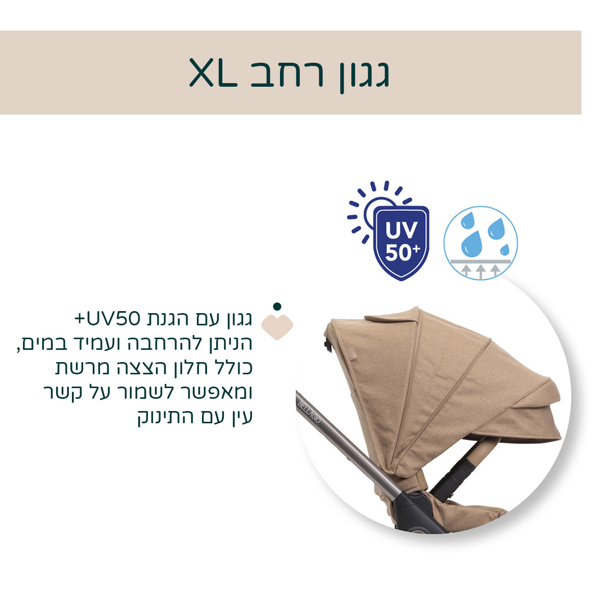 גגון UV50+ הניתן להרחבה ומציע הגנה מפני רוח, אור ושמש ועמיד במים. כולל חלון הצצה מרשת כדי לשמור על קשר עין תמידי עם התינוק.
