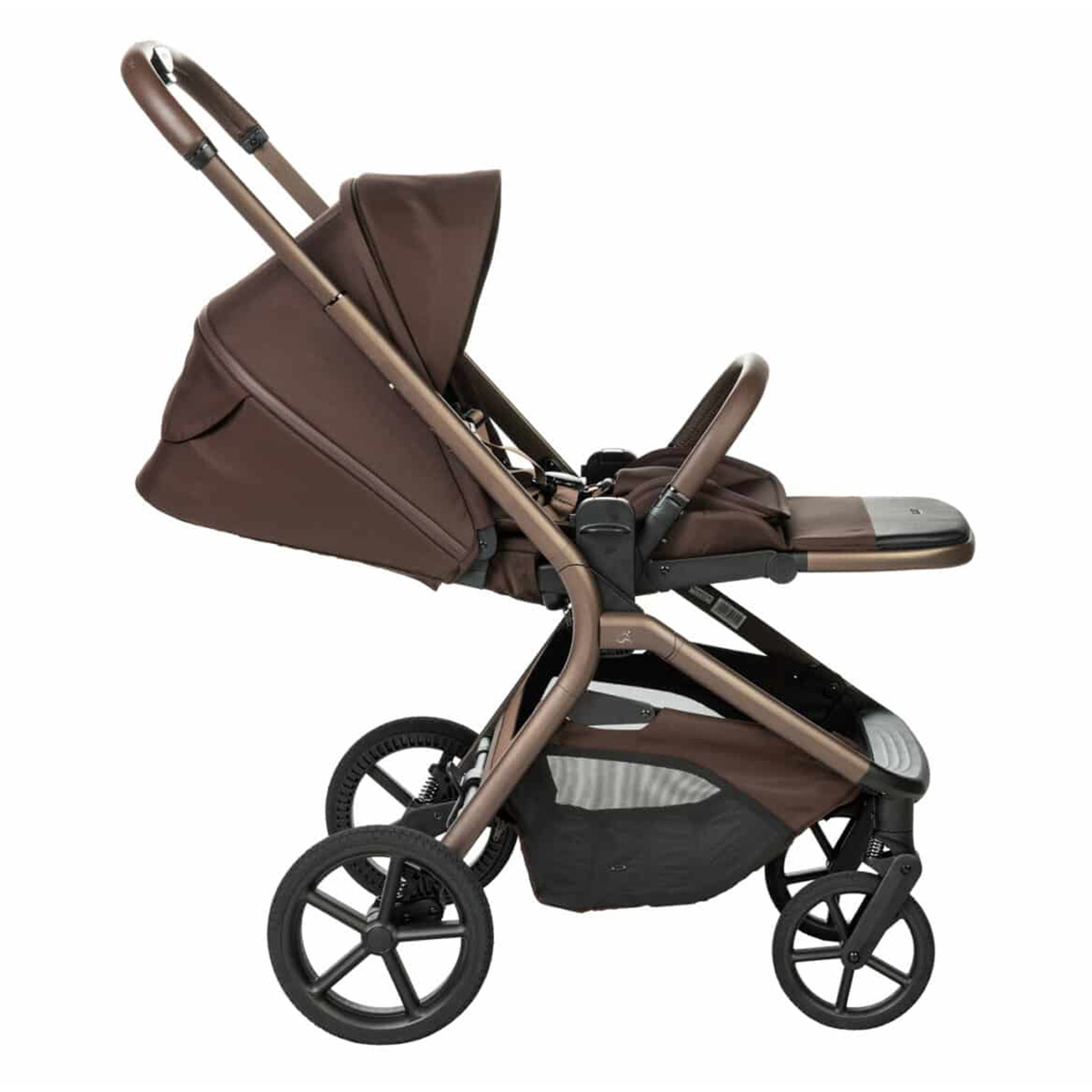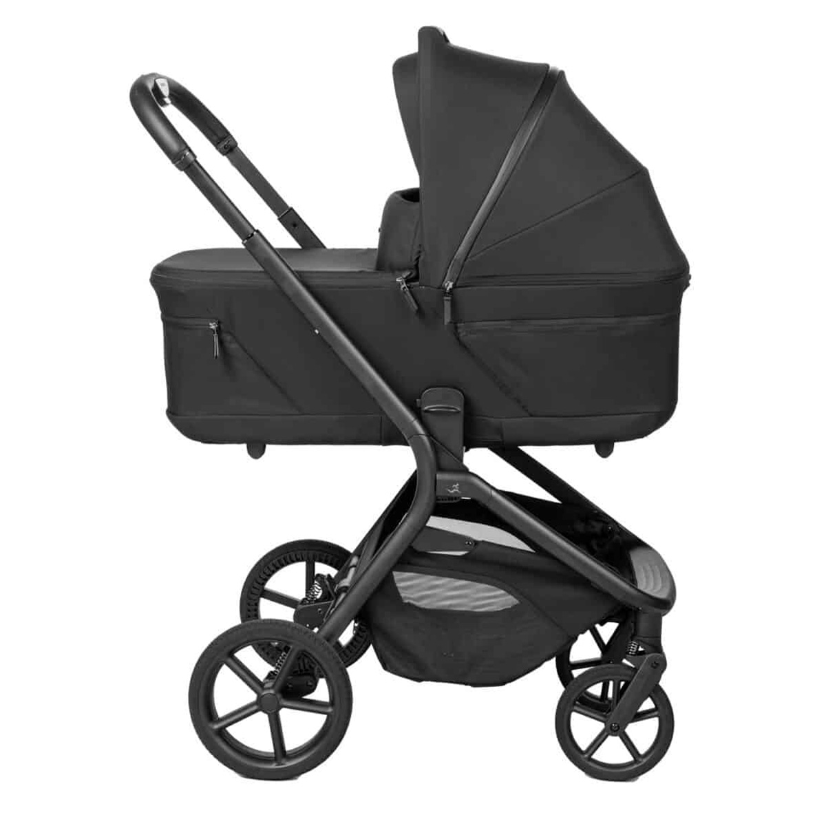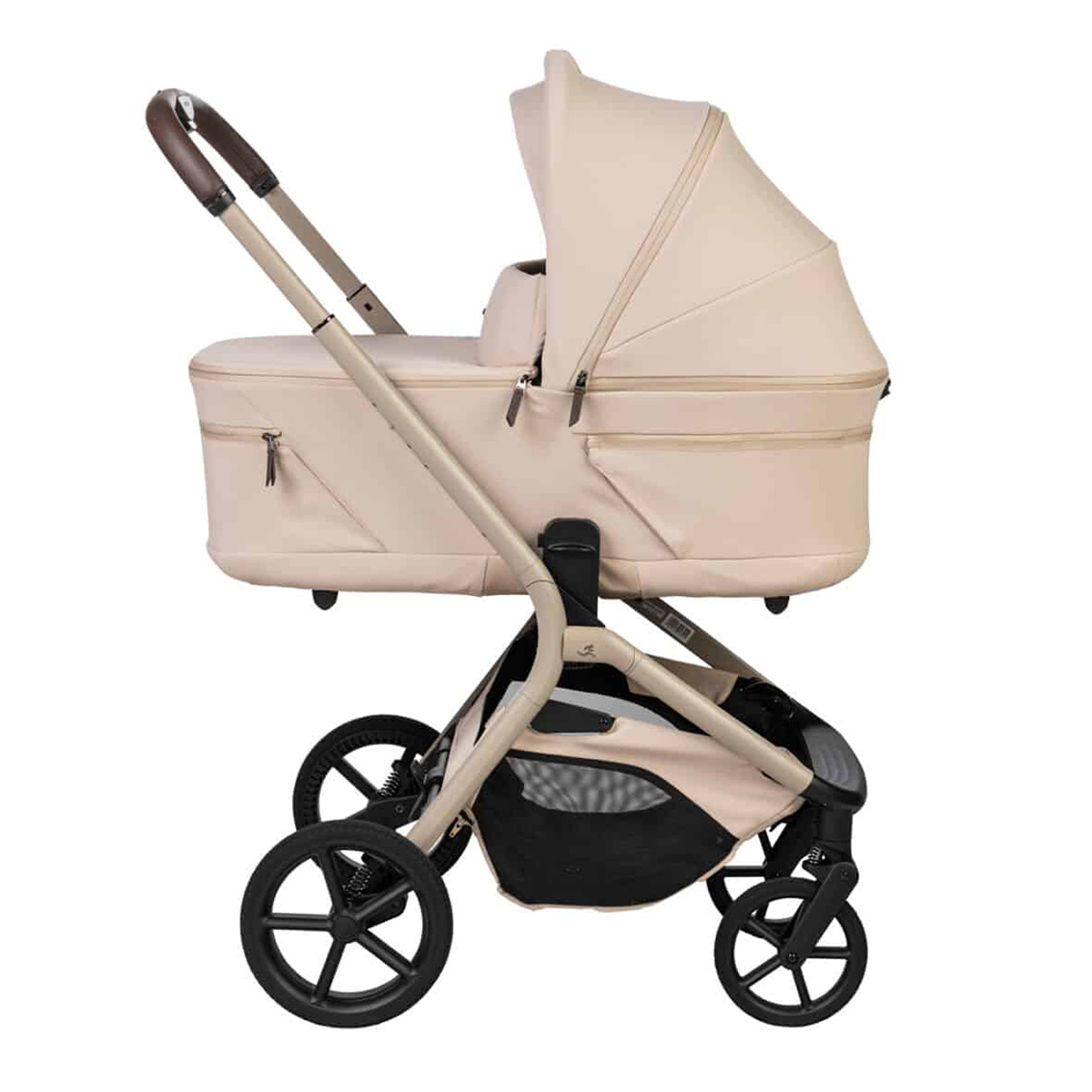 נוחות להורה: ידית אחיזה יוקרתית בציפוי דמוי עור וסל קניות XXL פתוח ונגיש.