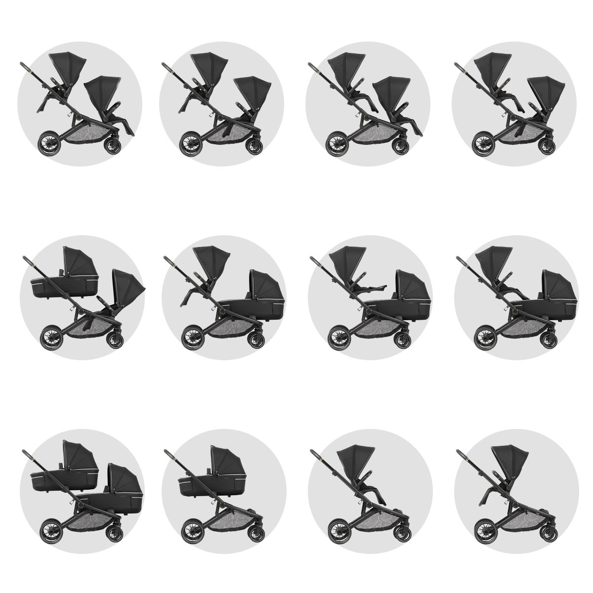 הודות ל-12 תצורות שימוש שונות נואל הופכת בקלות מעגלת יחיד לעגלת אחים או תאומים. מושבי הטיולון הדו-כיווניים מאפשרים התקנה עם ונגד כיוון הנסיעה, ושילוב מושב טיולון עם סל שכיבה בקלות.