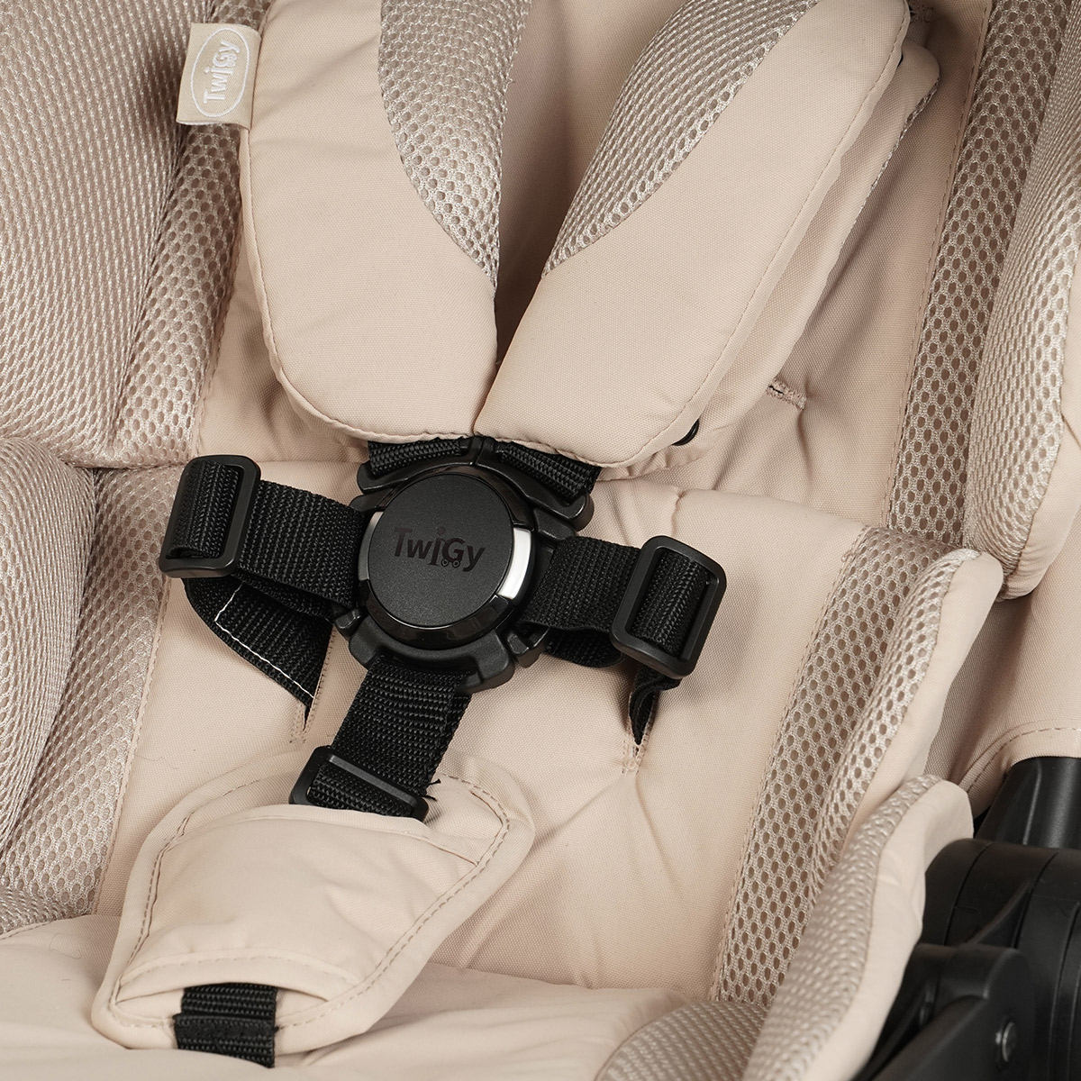 לעגלה מערכת רצועות בטיחות עם 5 נקודות חגירה, הכוללת אבזם מגנטי ובלם רגל אחורי לעצירה מלאה של הגלגלים.