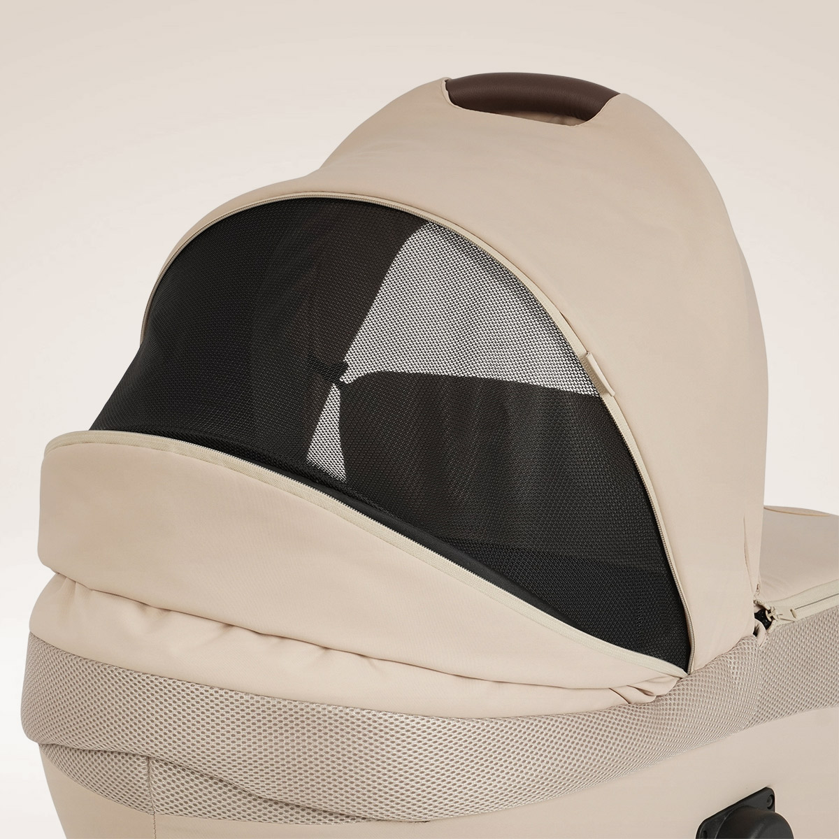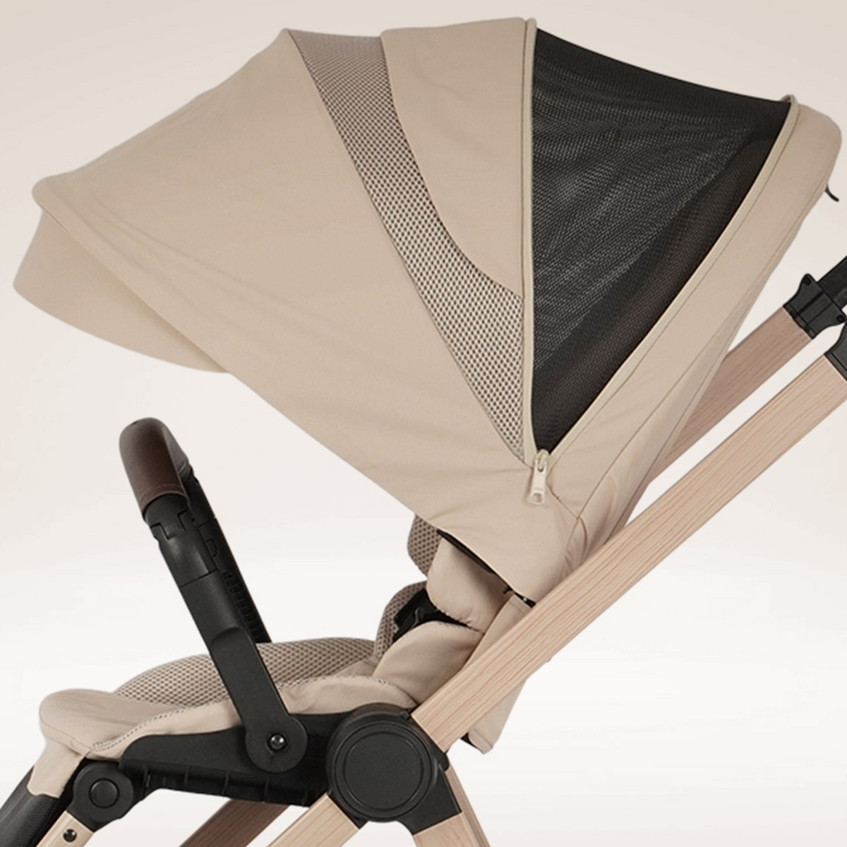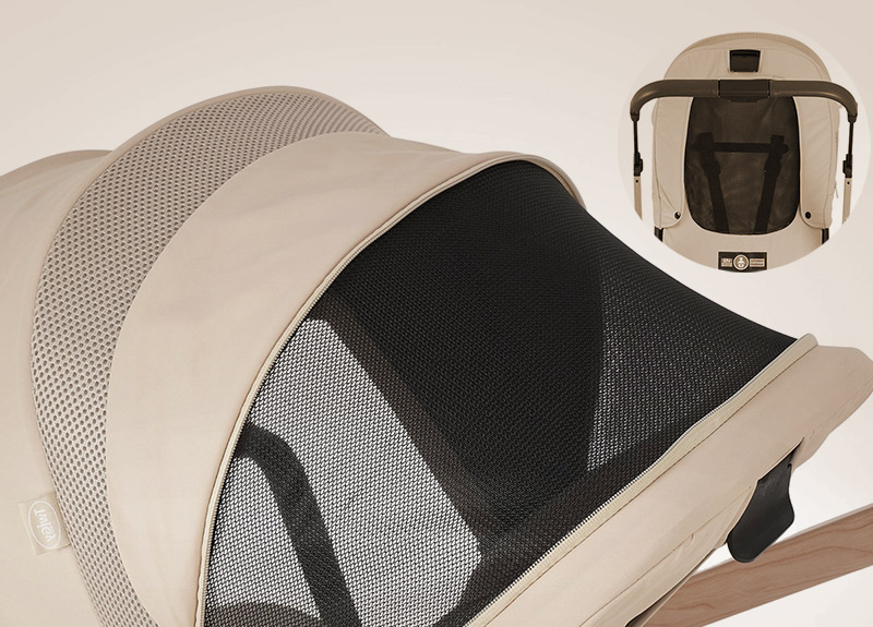 הגגון וגב המושב מצוידים בפתחי רשת רחבים לזרימת אוויר נעימה, קשר עין ישיר עם התינוק, והגנה מלאה מהשמש.