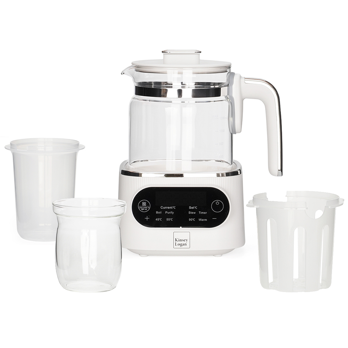 הקומקום הרב-תכליתי של Kinsey Logan יפשט את שגרת האכלה היומיומית ויאפשר חימום בקבוקי תינוקות, חימום חלב אם, הרתחת מים עבור הכנת בקבוק לתינוק, תה או קפה, בישול ואידוי מזון לתינוק, עיקור ועוד.