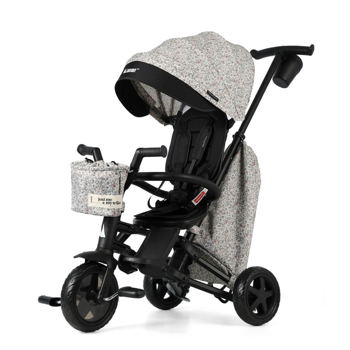 תלת אופן לילד, שעוצב על ידי Minene X QPLAY, עם 2 תיקי אחסון וגגון בהדפסים חדשים, ואלגנטיים.